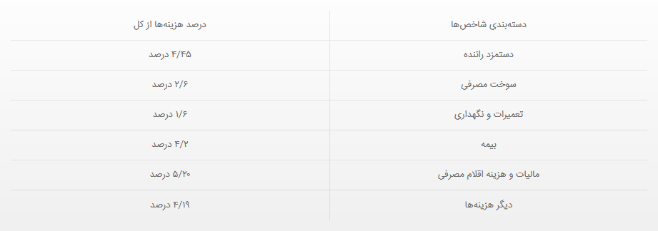 سهم هر پارامتر از کل هزینههای ناوگان طبق جدول زیر ارائه شده است.